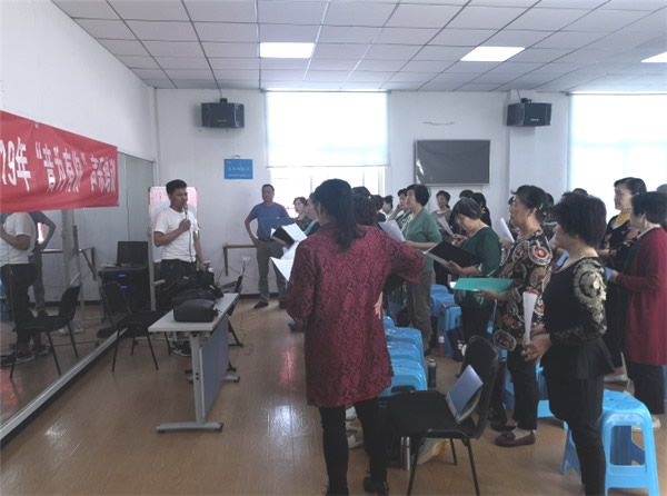 課堂上,聲樂老師帶領大家鞏固了一下上一堂課教導的呼氣、吸氣練習聲樂的基本功,歌唱練習中呼吸的控制和發聲技巧。此次培訓歐景苑社區的電子琴派上了大用處,王老師彈著合音,隨著電子琴的伴奏聲,王老師帶領大家合唱了一首《我和我的祖國》,復習一了上節課學習到的基本功,并糾正居民們的發聲方法。