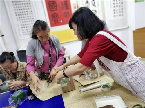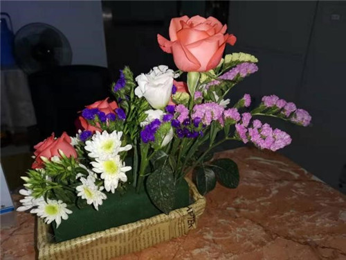 在居民們對花材有了基本認識之后,甄老師就開始一邊操作一邊講授理論知識,居民也跟著老師的節奏動起手來。先把花泥用透明膠粘好,然后確定好骨架、主花、配花的品種與搭配,主花里面顏色深的、大的花朵插在下面的位置,小的、顏色淺的插在上面的位置。經過一番努力,一會兒功夫,一盒盒色彩鮮艷、高低層次清楚的插花就完工了。