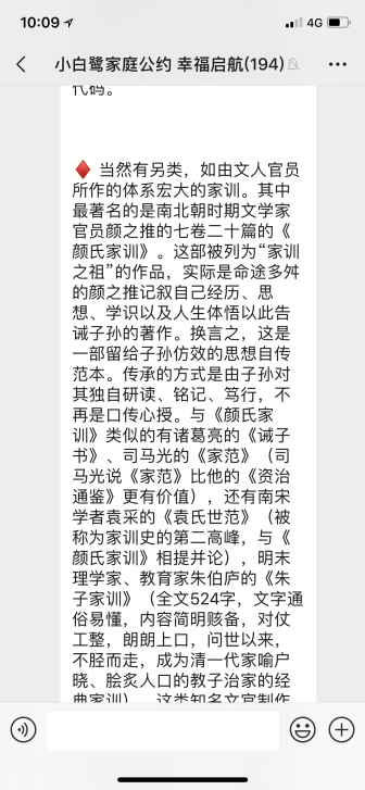 2019年12月12日,白鷺街小學(xué)家庭公約—幸福啟航微信線上學(xué)習(xí)群里,曼子老師從孔子的“庭訓(xùn)”講起,推及中國的家訓(xùn)特質(zhì)。她講到,古時家訓(xùn)一般不立文字,像孔子、湯家這樣的學(xué)富五車之家,都是不立文字的,用的是口傳心授之法,對幼童進行口授心授有著無可比擬的傳授效能。因為人類的直立導(dǎo)致母親產(chǎn)道狹窄,而人的腦袋又越來越大,只好提前分娩,讓嬰兒在母親體外完成發(fā)育,這也就意味著幼童大腦發(fā)育過程較長,在其發(fā)育過程中的口傳心授家訓(xùn),其銘刻效果最佳。特別是母親的口傳心授,在諄諄言教之時便有切切身教之師范,說服力極強,所以母親被定義為“民族品格第一塑造人”。