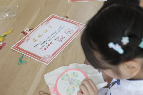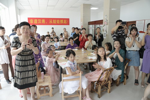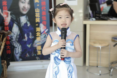 24日上午,在位于武昌民主路的湖北木蘭花職業培訓學校內,百名少兒捏著繡花針,在漢繡傳承人黃春萍的指導下,勾勒出一幅幅自己喜歡的圖案。今年3歲的小向向告訴記者,她是受奶奶的影響喜歡漢繡,平常也會學習古詩,她想做一名小傳承人。