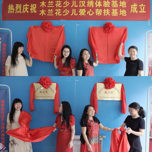 華中科技大學EDP中心汪瓊主任、湖北木蘭花社會工作服務中心理事長熊英、漢繡傳承人黃春萍大師、中華路街道付曉旭副主任為基地揭牌