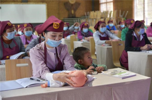 “小臉蛋胖乎乎,寶寶愛笑不愛哭”伴著朗朗的兒歌,學員在講師的指導下認真練習嬰兒撫觸操。學好寶寶的專業護理,不僅可以幫忙寶寶提高免疫力,還可以促進寶寶身體發育。