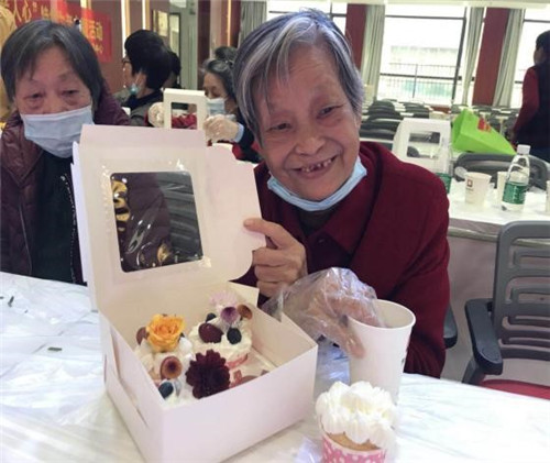 演出結束后,社區老年人展開了網紅手作烘焙課程-花彩紙杯蛋糕。活動現場,社區老年人們由烘焙桂老師教授進行蛋糕基底的制作,老人們看得非常認真,并紛紛參與現場烘焙互動。再教授完基底制作后,桂老師又指導著現場的爺爺奶奶們進行打發奶油和蛋糕裱花的制作過程。重陽節有著賞菊的習俗,在中國古俗中,菊花象征長壽,菊是長壽之花。我們采用新鮮的菊花作為裝飾材料,指導老人們裝裱著屬于自己的長壽蛋糕上,欣賞著自己的作品,社區老年人們的臉上洋溢著快樂的笑容。