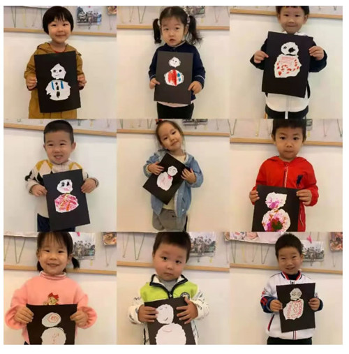 (3)將材料粘在黑色卡紙上,黑色記號筆畫出雪人眼睛和紐扣。