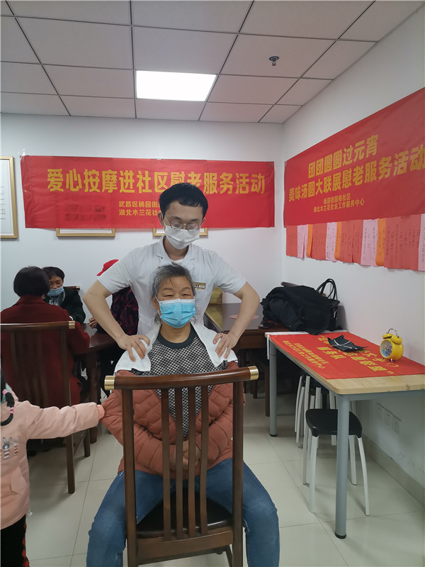為提高社區(qū)居民的保健養(yǎng)生意識,國棉社區(qū)聯(lián)合湖北木蘭花社會工作服務中心于社區(qū)養(yǎng)老中心聯(lián)合舉辦了“愛心按摩進社區(qū)”慰老服務活動,為社區(qū)的居民送上了健康和溫暖。