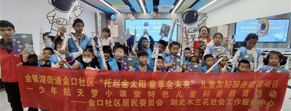 10月21日,武漢市東西湖區金銀湖街道金口社區攜手湖北木蘭花社會工作服務中心,開展“托起金太陽,童享金未來”兒童友好服務建設項目——“少年航天夢”特色課堂兒童科普教育活動,30余名青少年參加此次活動。
