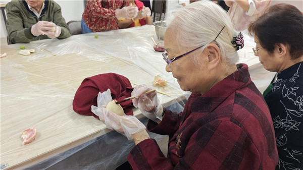 壽桃花饃不僅造型精美,寓意長壽與吉祥,還承載著深厚的民俗文化和人們對美好生活的向往。因此,此次別開生面的非遺中式面點制作活動,特別選擇壽桃花饃這一傳統(tǒng)手工藝品作為學習與制作的對象。活動邀請面點老師向大家講解壽桃花饃的歷史背景、文化寓意及制作技巧。接下來,老師現(xiàn)場示范和面和揉面,當面揉的比較光滑后,分成大小相同的介子,再用手掌揉成水滴狀,最后用筷子壓痕,并加上兩片綠色葉子狀的面,一個壽桃花饃就制作成功了。老人們在面點老師的指導下制作出壽桃花饃。社工們將制作好的壽桃放在蒸鍋上蒸。