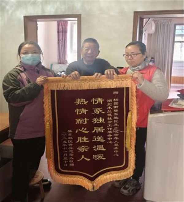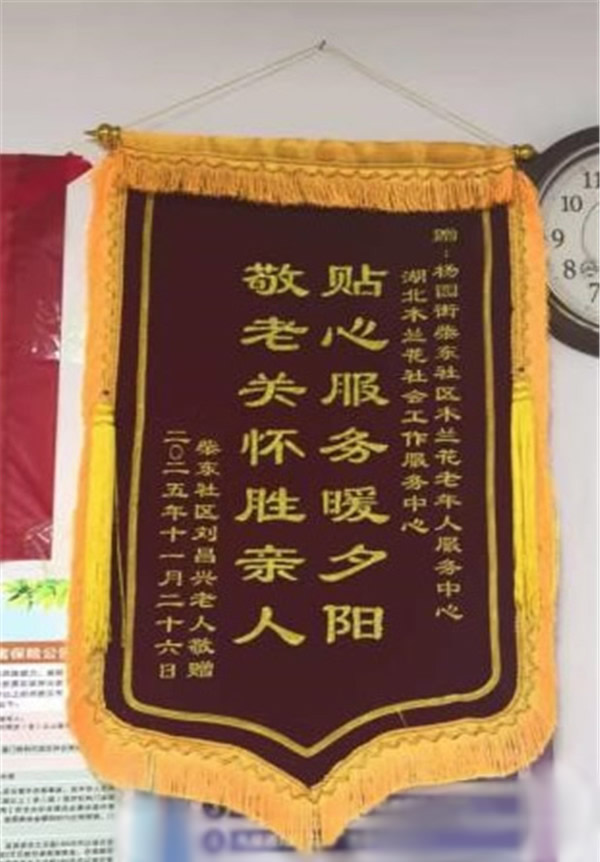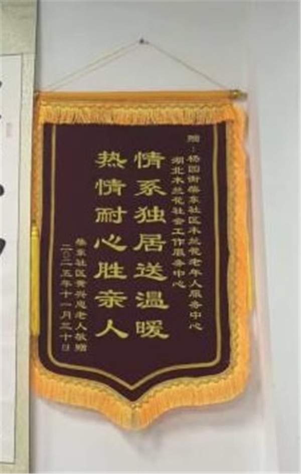 “這面錦旗,是我們全家的心意!”黃興忠老人送來的錦旗上,“情系獨居送溫暖,熱情耐心勝親人”十四個字格外醒目。他今年84歲,子女遠住的比較遠,家里的水管漏水、電燈損壞,都是社區老年人服務中心的工作人員上門幫忙修理;天氣變化時,還會特意打電話提醒他添衣保暖。“上次我感冒發燒,工作人員不僅幫我買了藥,還熬了粥送過來,說‘您趁熱喝,發發汗就好了’,這話聽得我心里比粥還暖。”